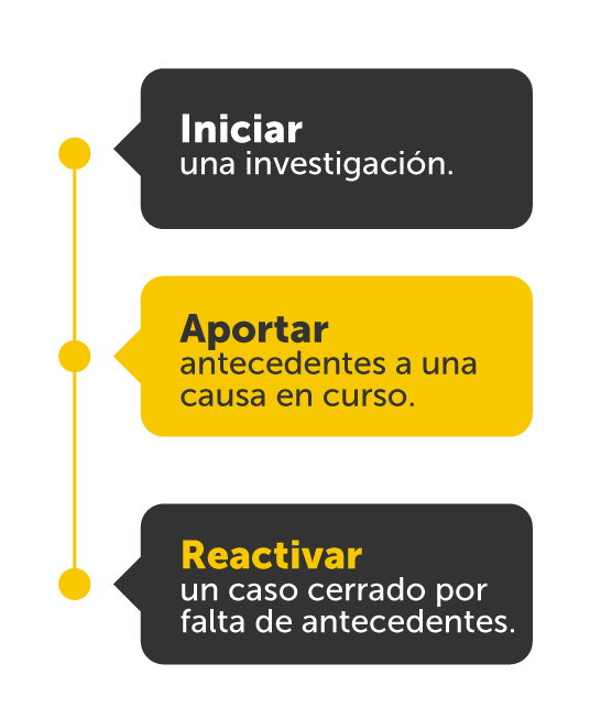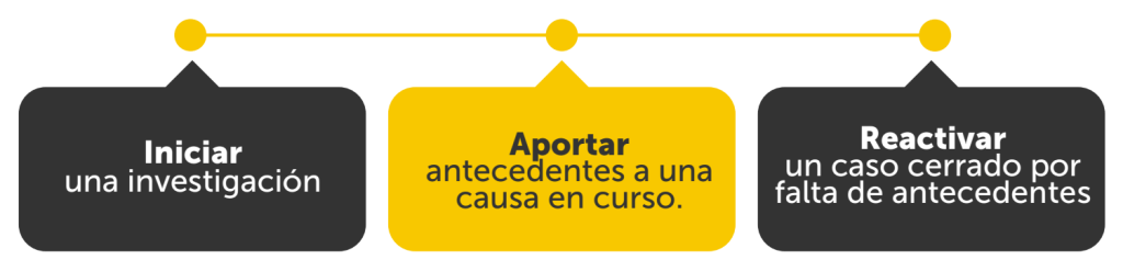 A partir de los antecedentes entregados por los ciudadanos, y si estos son suficientes, el programa realiza una denuncia al Ministerio Público para iniciar la investigación y persecución penal de los hechos con ayuda de las policías.